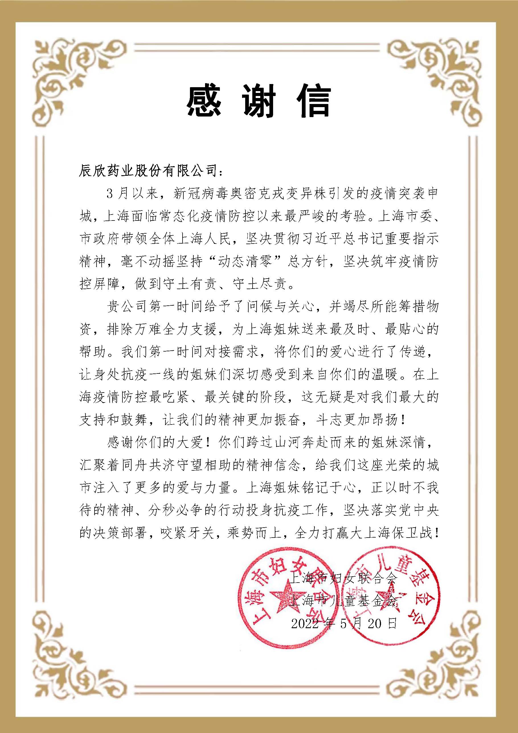 近日,辰欣藥業(yè)收到一封來自上海抗疫前線發(fā)來的感謝信,感謝公司在上海面臨最嚴(yán)峻的疫情考驗時,第一時間給予問候與關(guān)心,并竭盡所能籌措物資,排除萬難全力支援,為上海送去最及時、最貼心的幫助。
