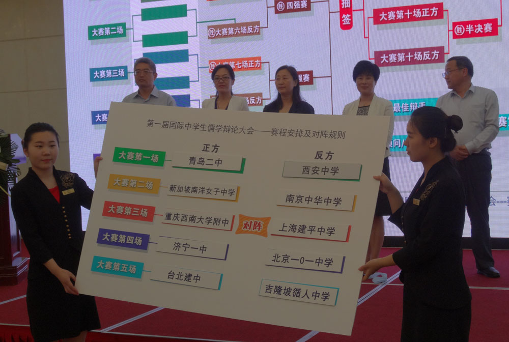 第一屆國際中學生儒學辯論大會十支代表隊分別來自北京市第一零一中學、上海建平中學、重慶西南大學附屬中學、南京中華中學、西安中學、臺北建中、青島二中、濟寧一中、新加坡南洋女子中學校以及馬來西亞吉隆坡循人中學。主辦方的與會代表,共同抽取了十支代表隊的對陣分組。在未來的兩個月的時間內(nèi),這十支中學生代表隊將按照對陣分組情況進行捉對“廝殺”,他們從儒學價值取向出發(fā),就網(wǎng)友評選出的社會熱點問題進行辯論。